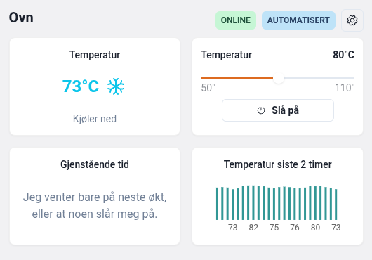 Overstyr ovenen manuelt, skru av eller på, eller sett den på auto. Sett temperaturen og varighet.
